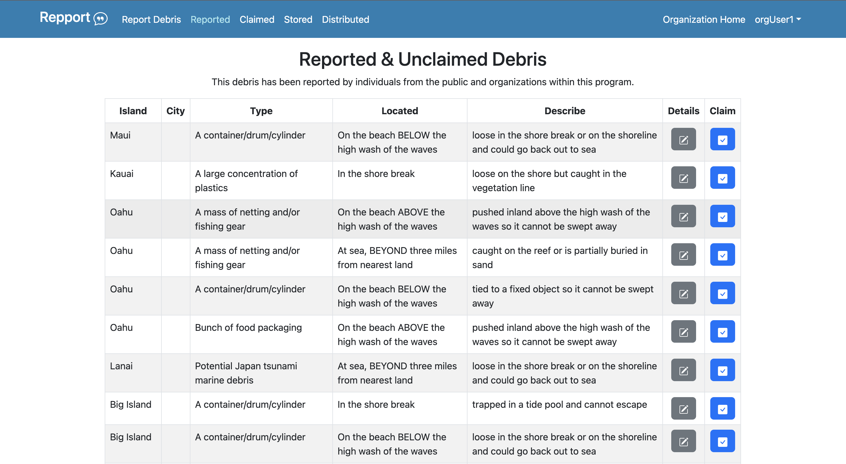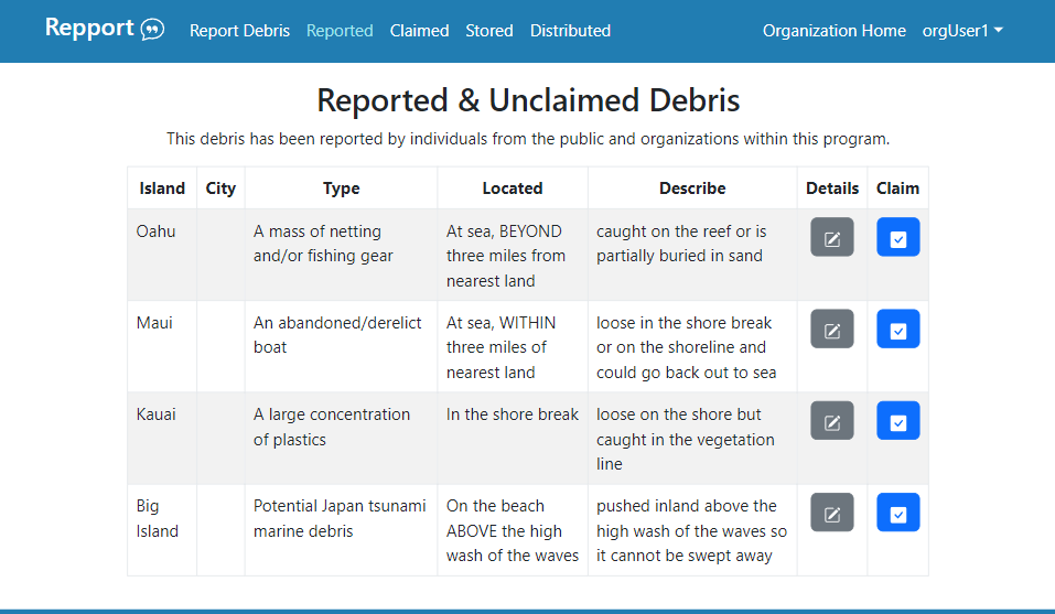 The Reported section provides a table listing all newly submitted debris that hasn’t been collected yet. This table highlights key information about each debris report and provides two buttons for each entry: Details and Claim. The Details button opens a new page that displays comprehensive information about the debris event and provides options to edit some data. The Claim button indicates an organization’s intent to collect the debris. Clicking this button transfers the debris report to the “Claimed” section.