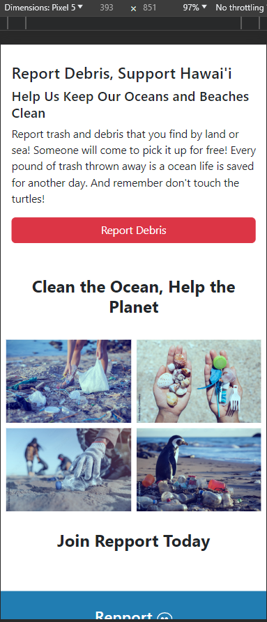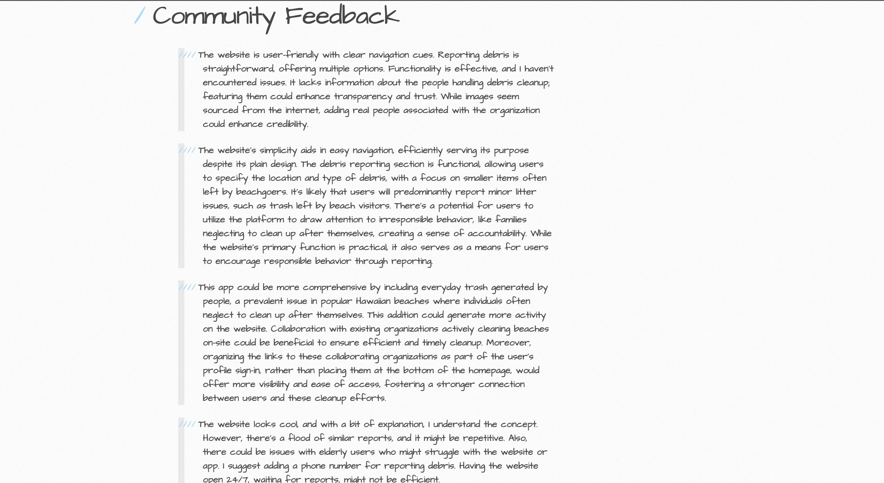 This app could be more comprehensive by including everyday trash generated by people, a prevalent issue in popular Hawaiian beaches where individuals often neglect to clean up after themselves. This addition could generate more activity on the website. Collaboration with existing organizations actively cleaning beaches on-site could be beneficial to ensure efficient and timely cleanup. Moreover, organizing the links to these collaborating organizations as part of the user’s profile sign-in, rather than placing them at the bottom of the homepage, would offer more visibility and ease of access, fostering a stronger connection between users and these cleanup efforts.