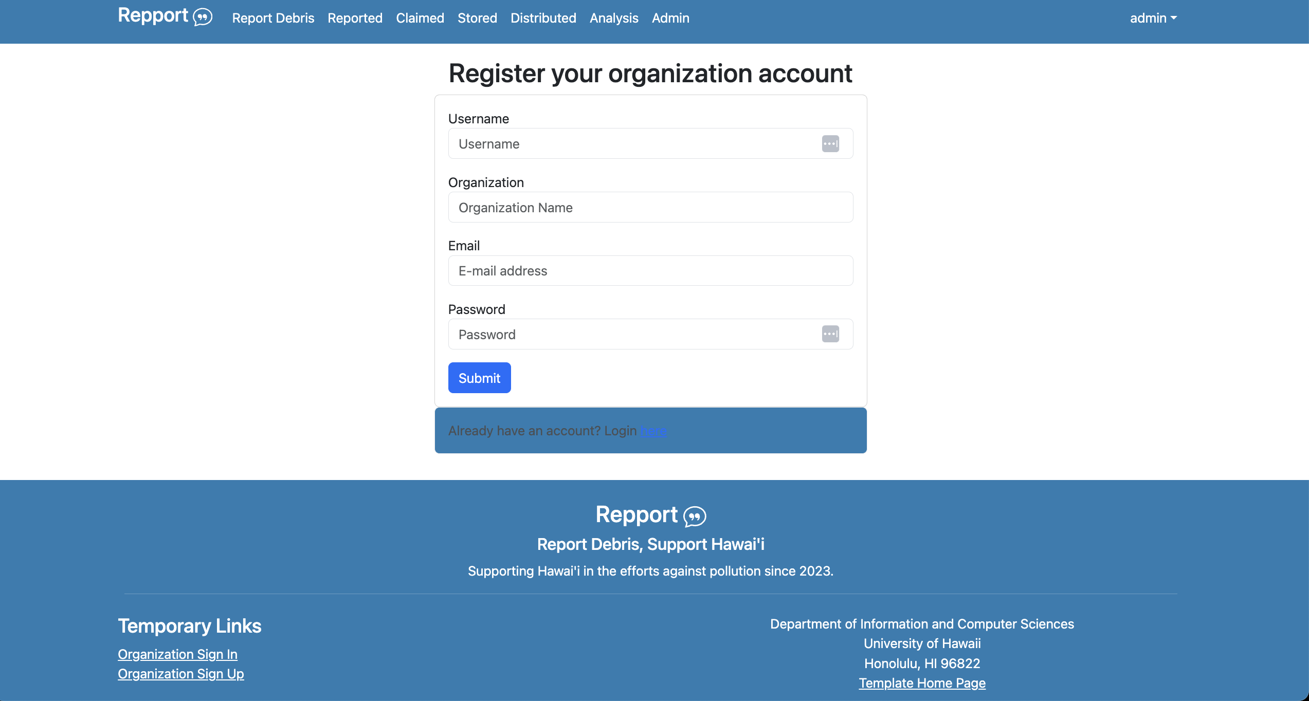 To view reported debris, organizations must sign in with their organizational login credentials. They can register for the site and create a new user account under their organization’s name. The links for registration are available in the footer under “Organization Sign In” and “Organization Sign Up”.